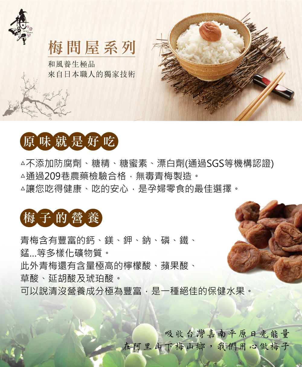 堅持不添加防腐劑、糖精、糖蜜素、色素、漂白劑並通過202項農藥檢測合格(比國家標準更嚴格,皆通過SGS認證),無毒青梅製造,讓您吃的