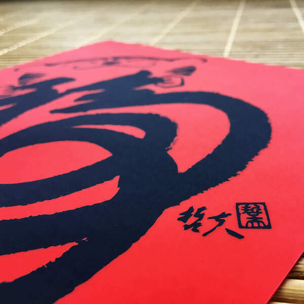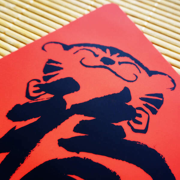 水墨名家黃哲夫以書入畫,圖繪虎首,再用福字線條勾勒虎背身形,結合出此意趣生動之作。