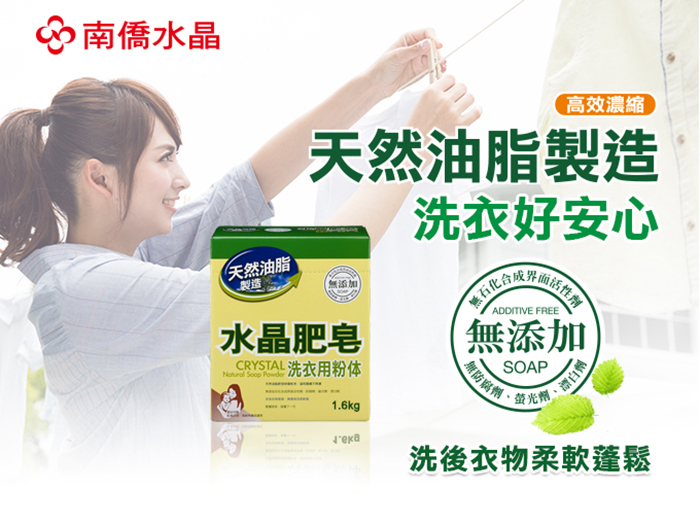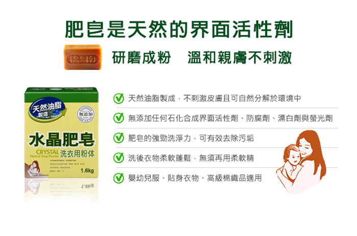 水晶肥皂粉體為低刺激性、低敏感性、高安全性產品,無添加著色料、保存劑、防腐劑、柔軟劑、漂白劑及螢光劑、化學界面活性劑等,此類易致皮膚過每成份OUT!