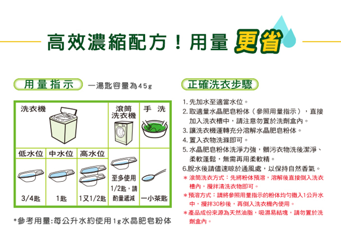 2.取適量水晶肥皂粉體(參照盒身用量指示說明),倒入洗衣槽中,請勿置於洗劑盒內。