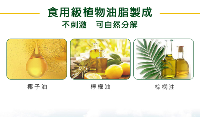主要成份:天然植物油肥皂(脂肪酸鈉皂)、硬水軟化劑、香茅油。