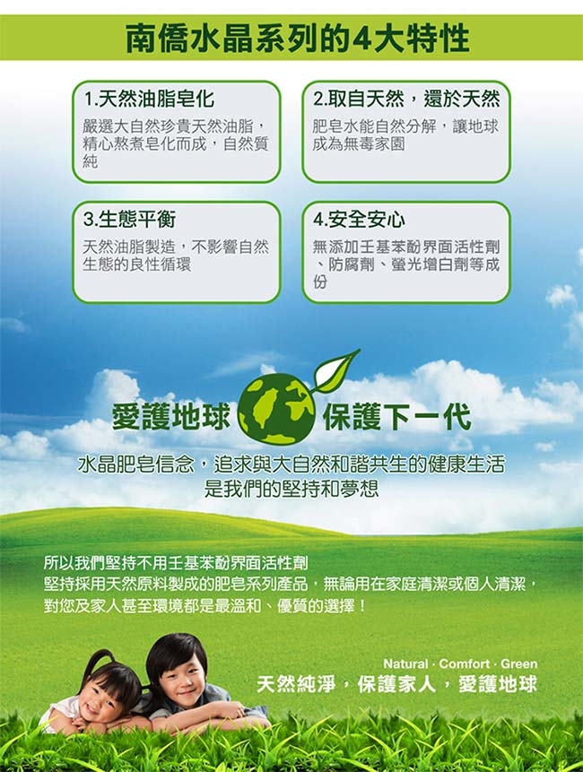 100%純皂洗淨成份,「Natural Soap」無添加著色料、防腐劑、柔軟劑、漂白劑及螢光劑、石化合成界面活性劑等,此類易致皮膚過每成份OUT!健康天然,優質生活新選擇。