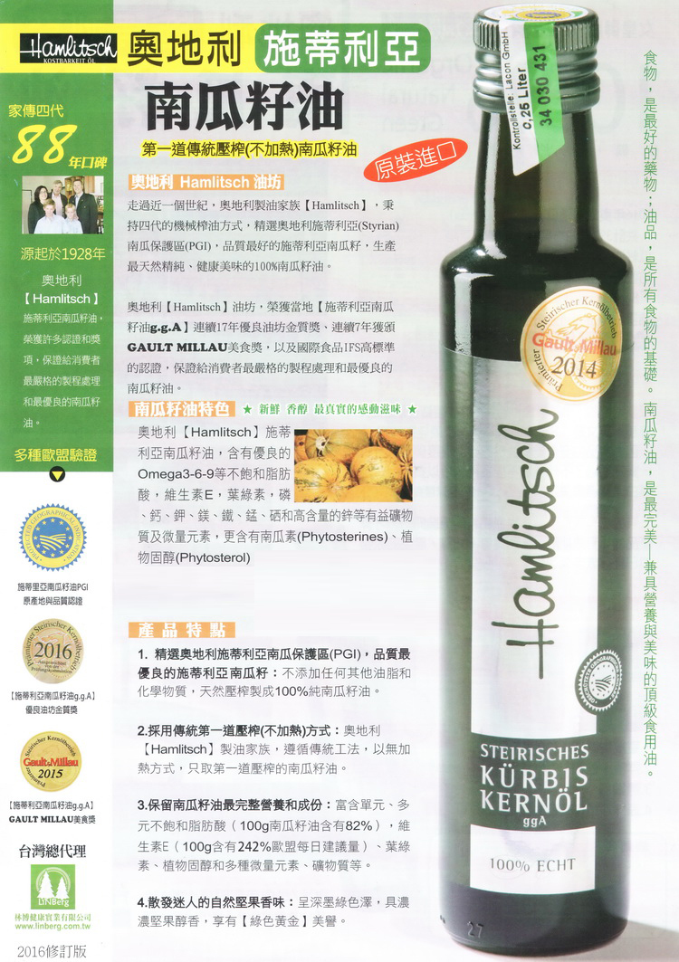 | 營養成份: | 熱量:82.8大卡 蛋白質:0公克 脂肪:0公克 飽和脂肪:1.7公克 反式脂肪:0公克 單元不飽和脂肪酸4.2公克 多元不飽和脂肪酸 3.3公克 碳水化合物:0公克 鈉:0毫克 膽固醇:0毫克 |