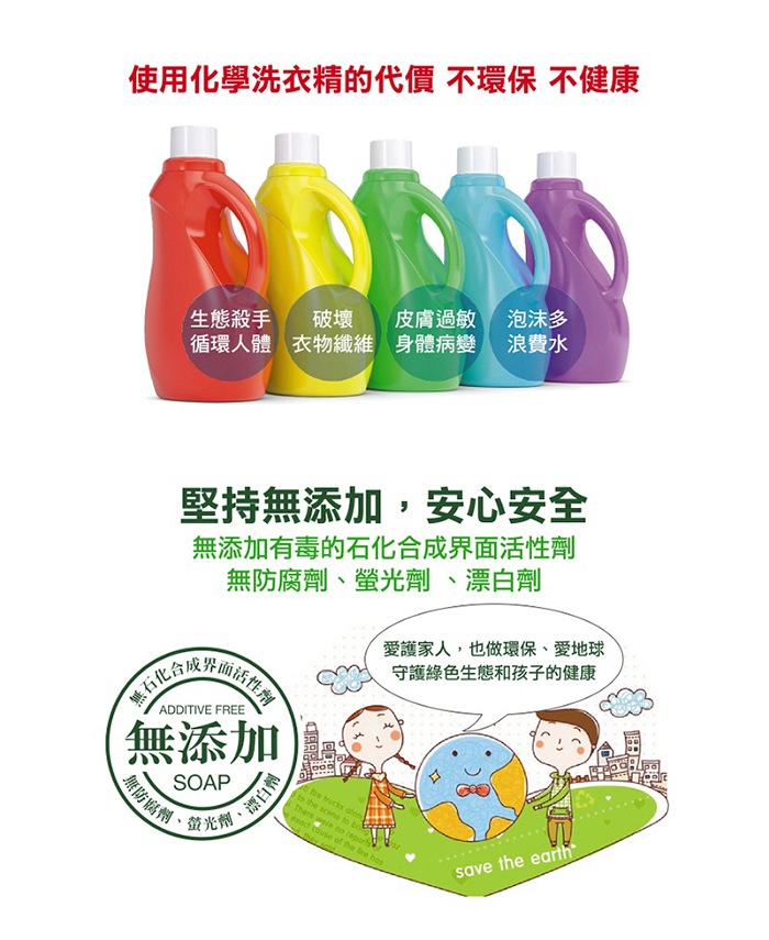 100%純皂洗淨成份,「Natural Soap」無添加著色料、防腐劑、柔軟劑、漂白劑及螢光劑、石化合成界面活性劑等,此類易致皮膚過每成份OUT!健康天然,優質生活新選擇。