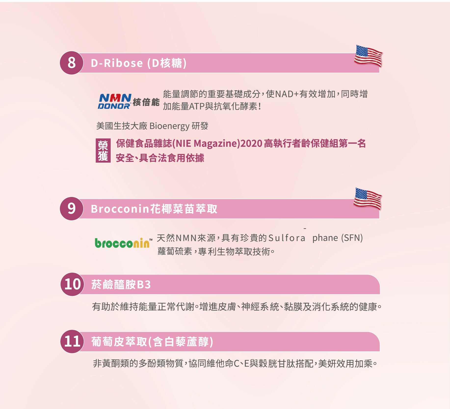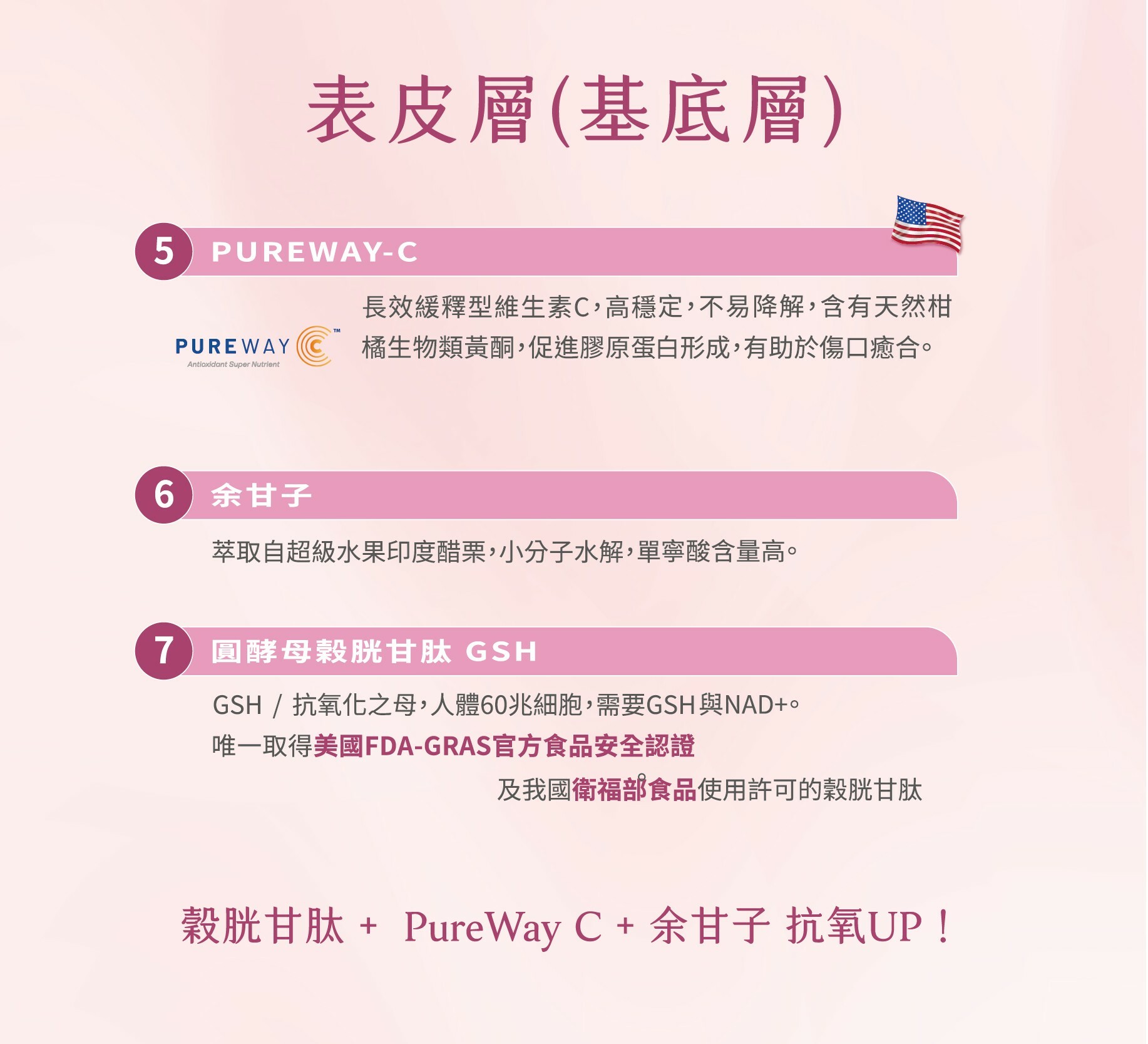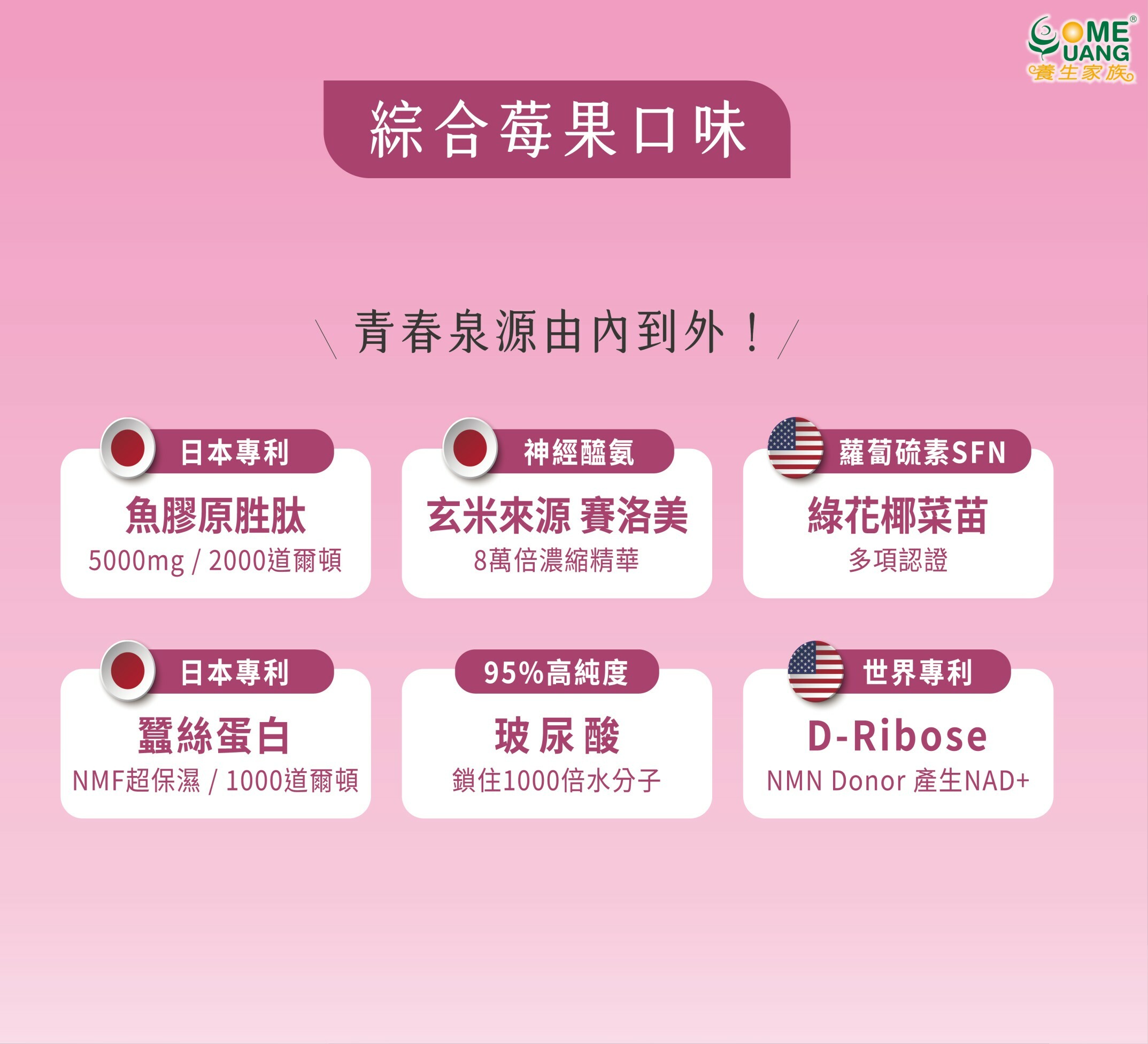 玄米萃取賽洛美/圓酵母穀胱甘肽/蠶絲蛋白/PureWay C/玻尿酸/余甘子/ /葡萄皮萃取(含白藜蘆醇)/菸鹼醯胺