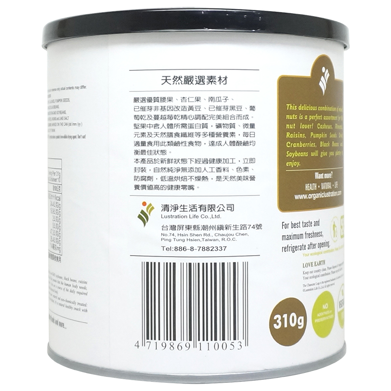 | 內容物名稱: | 腰果、杏仁、南瓜子、葡萄乾、黑豆、非基因改造黃豆、蔓越莓乾、葡萄乾、湖鹽 |