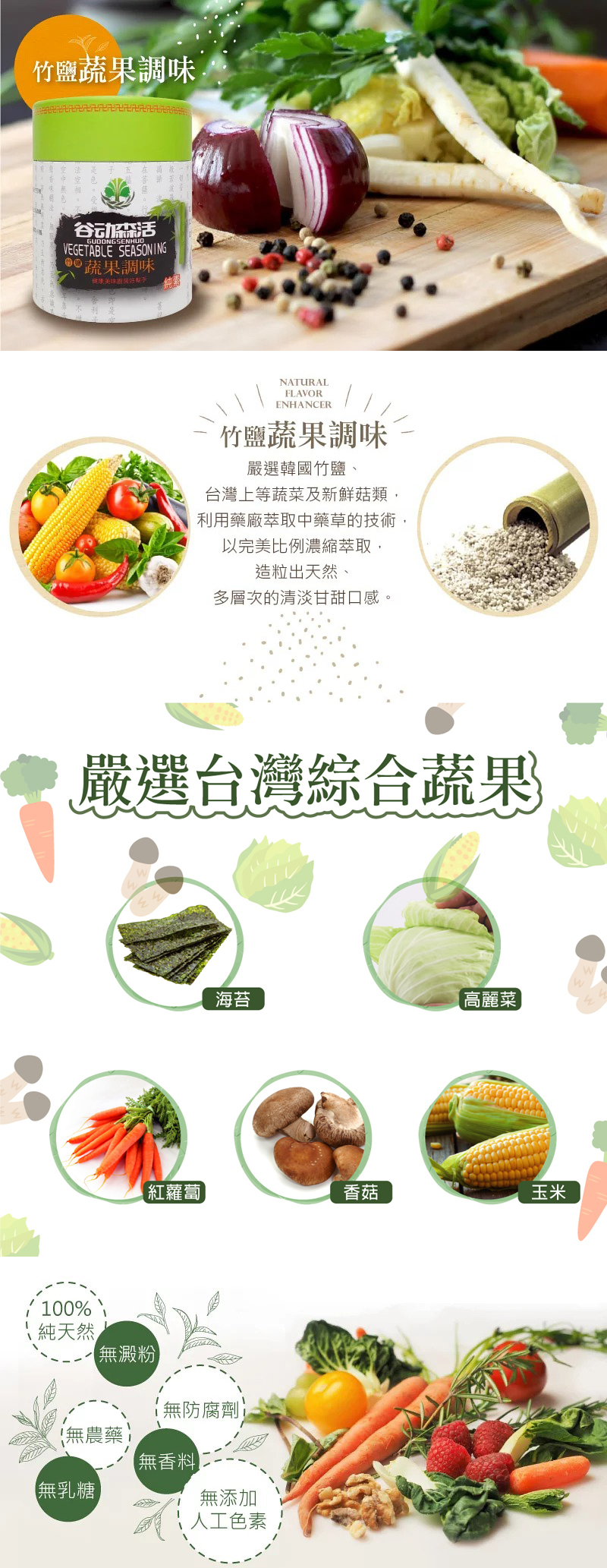| 內容物名稱: | 竹鹽、蔬果萃取物(海苔、松茸、高麗菜、紅蘿蔔、玉米、香菇) |