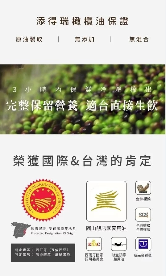 添得瑞橄欖油產自-1839年Sempere家族至今第六代,是受西班牙(瓦倫西亞省)政府保護企業,家族179年來獲獎無數!傳承最傳統的初榨冷壓工法,黃金橄欖果汁,嚴選世界頂級ARBEQUINA、PICUAL品種,保留果實菁華維生素E及豐富的單元不飽和脂肪,酸度百分之0.2(遠低於國際標準百分之0.8)抗氧化物!是最適合煎煮炒炸生機飲食、蔬食,追求健康養生的食用油。