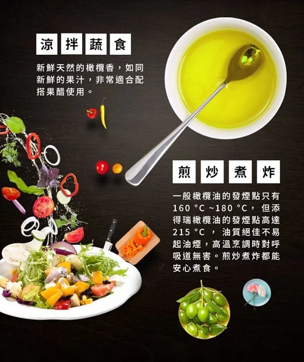 4、傳承最頂尖的初榨冷壓工法,是黃金橄欖果汁,嚴選世界頂級ARBEQUINA、PICUAL品種,保證手工採收後3小時內冷壓,保留果實菁華維生素A、D、E、K及豐富的單元不飽和脂肪,酸度0.2 % 低於國際標準之0.8 % 是最適合煎煮炒炸生機飲食、蔬食,追求健康養生的食用油。