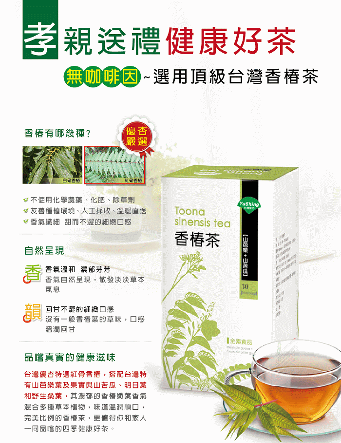台灣優杏第二代新配方香椿茶嚴選台灣本土特產之香椿植物並摘取香椿的嫩葉部份,