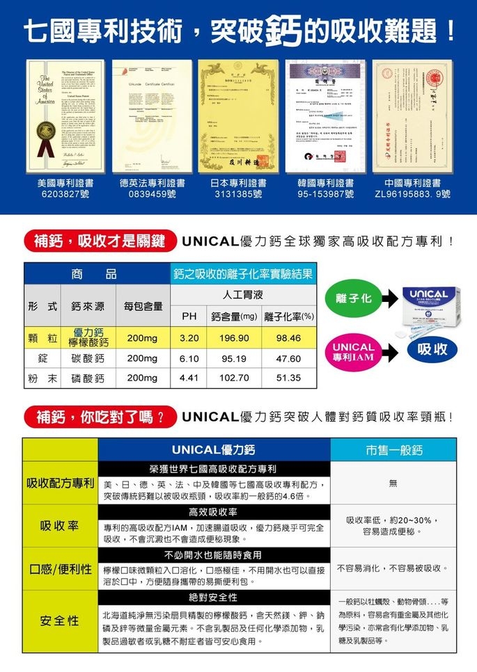 「UNICAL優力鈣」顆粒有專利的IAM吸收配方,離子化後的鈣,能充分的被腸道吸收,確實地使牙齒和骨骼正常發育,以及身體各