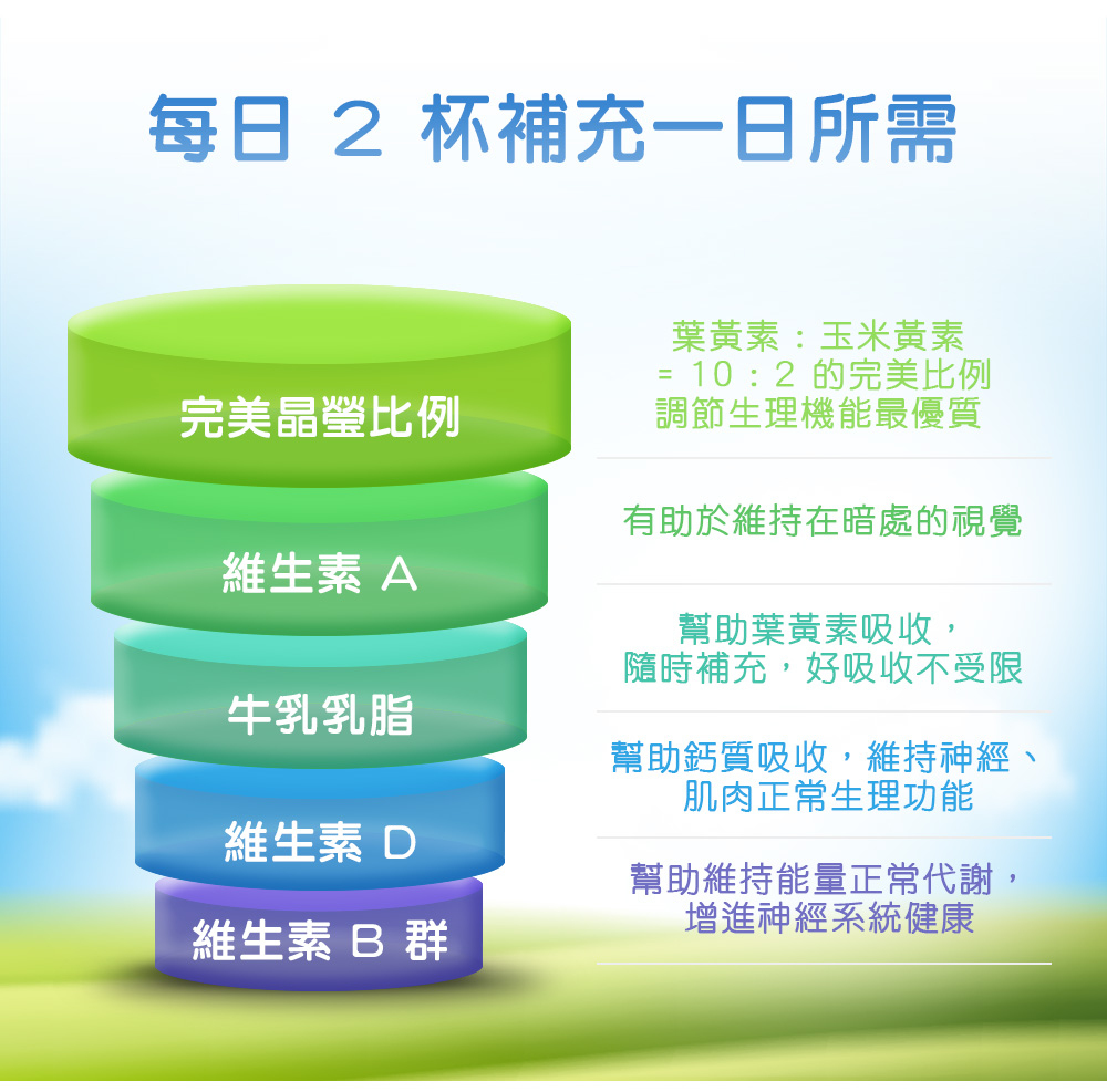 葉黃素及玉米黃素以 10:2 的完美晶瑩比例添加,調節生理機能最優質