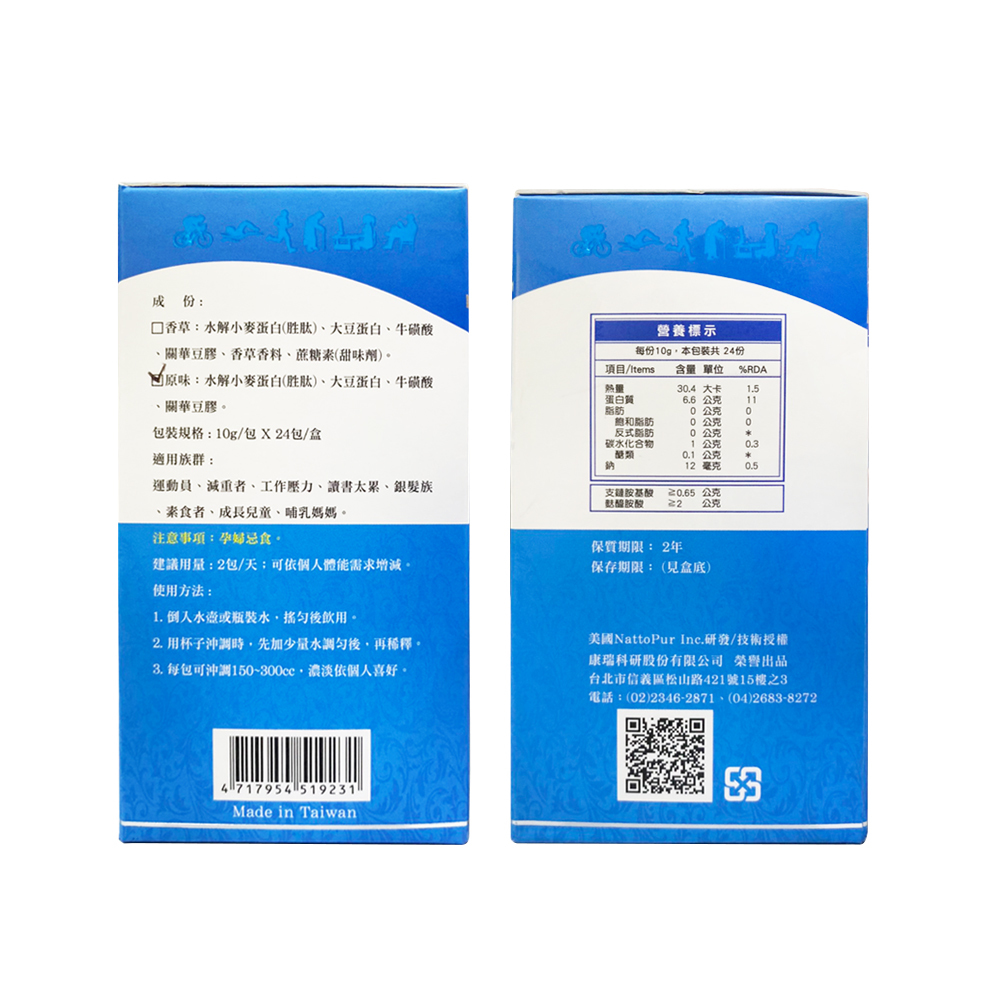 成份:水解小麥蛋白(胜肽)、大豆蛋白、牛磺酸、關華豆膠。